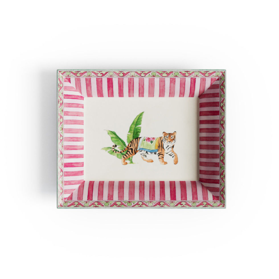 Un dipinto romantico ed evocativo che ha come protagonista un piccolo tempio indiano immerso in una vegetazione tropicale e protetto da una tigre dormiente, simbolo di forza e regalità. Come cornice ha le immancabili stripes di Lisa Corti, declinate in quattro delicati colori pastello: rosa, arancio, blu e verde.
