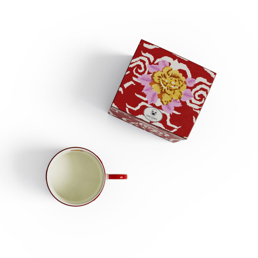 La tazza è racchiusa in una scatola quadrata con il rispettivo disegno che può prestarsi a custodire piccoli oggetti e a diventare un colorato elemento di arredo.