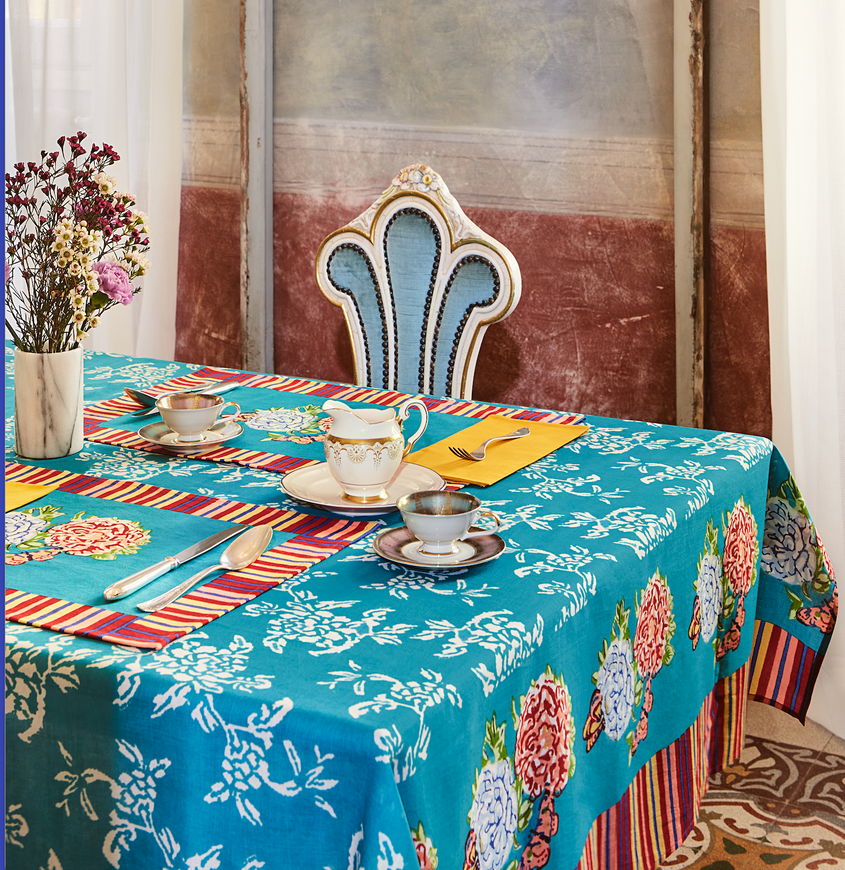 Le tovagliette in cotone di Lisa Corti aggiungono estrosa raffinatezza a ogni pasto, da una tranquilla colazione in terrazza a un'allegra cena in giardino con gli amici. Possono essere mescolate con le tovaglie in tessuto della collezione per giocare a comporre ogni giorno nuove esplosioni cromatiche. Questa stampa nasce dalla combinazione tra un pattern geometrico ispirato a un motivo tibetano e l'iconico Queen Flower che è un classico dello stile del brand. Realizzata artigianalmente con la tecnica screen printed in un acceso blu oltremare, è incorniciata da un motivo a stripes in toni aranciati che riprende il caldo colore dei petali. Pensate per essere usate da sole o in combinazione con gli altri modelli creando un mosaico di fantasie e colori, queste tovagliette sono perfette per cambiare l'atmosfera della tavola con un tocco di colore eclettico o per un regalo inaspettato.
