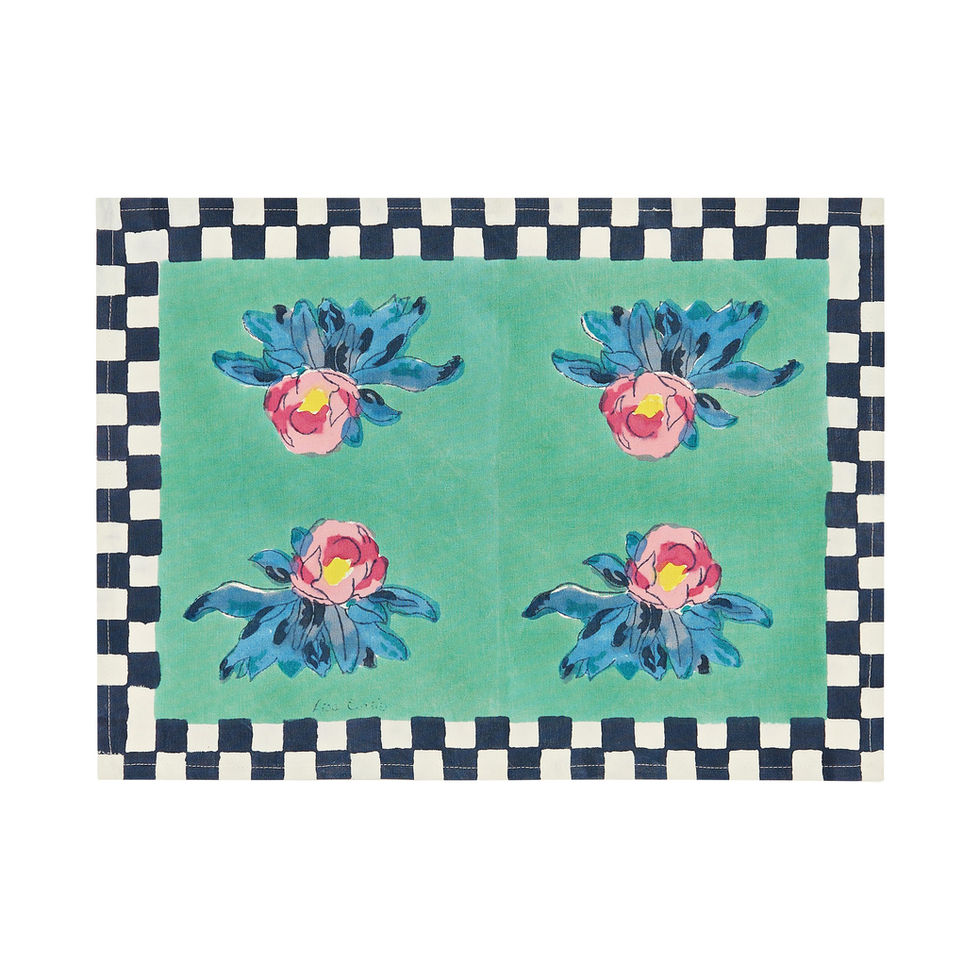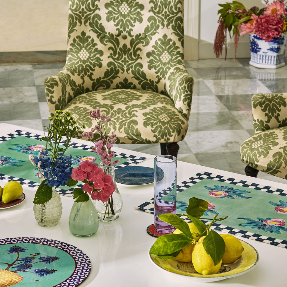 Le tovagliette in cotone di Lisa Corti aggiungono estrosa raffinatezza a ogni pasto, da una tranquilla colazione in terrazza a un'allegra cena in giardino con gli amici. Possono essere mescolate con le tovaglie in tessuto della collezione per giocare a comporre ogni giorno nuove esplosioni cromatiche. Su uno sfondo verde si stagliano quattro classiche rose nei toni del rosa, circondate da una cornice con motivo a scacchi bianco e nero. Pensate per essere usate da sole o in combinazione con gli altri modelli creando un mosaico di fantasie e colori, queste tovagliette sono perfette per cambiare l'atmosfera della tavola con un tocco di colore eclettico o per un regalo inaspettato.