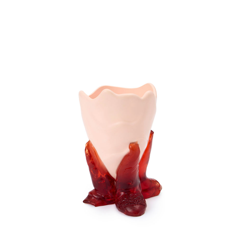 Disegnato da Gaetano Pesce per la collezione Fish Design, questo eccezionale vaso ha una forma ovale con quattro piedi di sostegno di ispirazione antropomorfa di colore rosso. Il vaso è interamente realizzato a mano in morbida resina stratificata in diversi colori che creano una texture singolare e accattivante. È perfetto per dare un tocco contemporaneo e un design funzionale alla vostra casa.